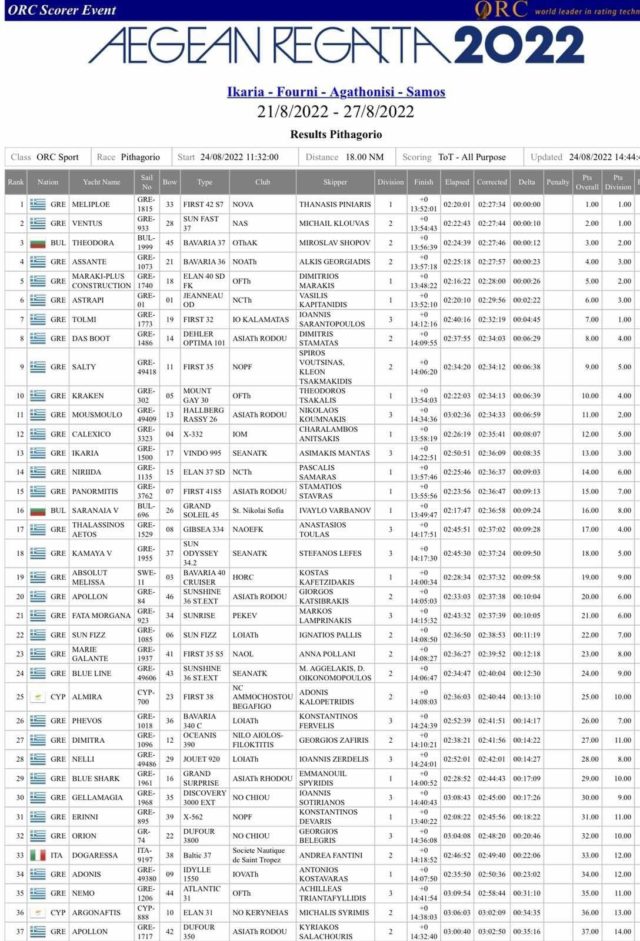 Στην Aegean Regatta που είναι σε εξέλιξη, έναν από τους μεγαλύτερους και πιο ανταγωνιστικούς Ιστιοπλοϊκούς αγώνες ανοικτής θάλασσας , ο Όμιλος μας με το σκάφος ΜελιΠλωι και κυβερνήτη τον προπονητή μας Πινιάρη Θανάση, διαπρέπει τόσο στην κατηγορία του όσο και στην overlall βαθμολογία !Χθες στην τρίτη ιστιοδρομία Αγαθονήσι – Πυθαγόρειο – Σάμου τερμάτισε πρώτο στην κατηγορία όσο και στην γενική βαθμολογία!