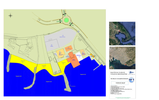 Race area is in Pagasitikos Gulf in front of Anavros Volos with typical Greek Summer weather conditions. Sea breeze from south east direction starts every day from 11.00 and hold an average of 11 knots until late in the afternoon. Many times, the velocity reaching 17 to 18 knots from 14.00 to 19.00 in a steady south easterly direction. There are no tides or current around the race area specially during the summer time. Nautical Club of Volos has a big venue including two ramps for launching the boats and two small beaches inside the area. Also, exactly next to it there is a big sandy beach of Anavros. in the middle of the venue there is a bar- restaurant owned by the Club which will be used for the needs of the championship.